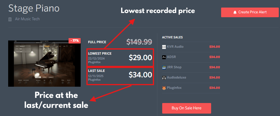 You’ll find this feature on every plugin and sample library page. It lets you track price trends over time, showing when and where products go on sale and how prices fluctuate across different stores.